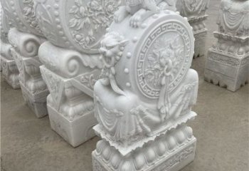 在雕刻風(fēng)格上,浮雕以淺層透雕與平面雕為主,漢白玉門(mén)墩雕塑明顯,刀法融精致于古樸大方,也有清代石雕的細(xì)膩繁瑣。漢白玉門(mén)墩雕塑自古以來(lái)會(huì)在大門(mén)外放置各獸類(lèi)或石鼓用來(lái)鎮(zhèn)宅。主要用于辟邪、納祥,兼有裝飾功能。吉祥門(mén)墩雕塑有鎮(zhèn)宅石獅、坑頭石獅子、端獸、門(mén)墩石、抱鼓、拴馬樁、泰山石敢當(dāng)?shù)取?/p>